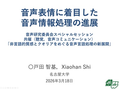 - 戸田 智基, Xiaohan Shi, "音声表情に着目した音声情報処理の進展," 日本音響学会2026年春季研究発表会, 招待講演, Mar. 2026.【講演スライド】