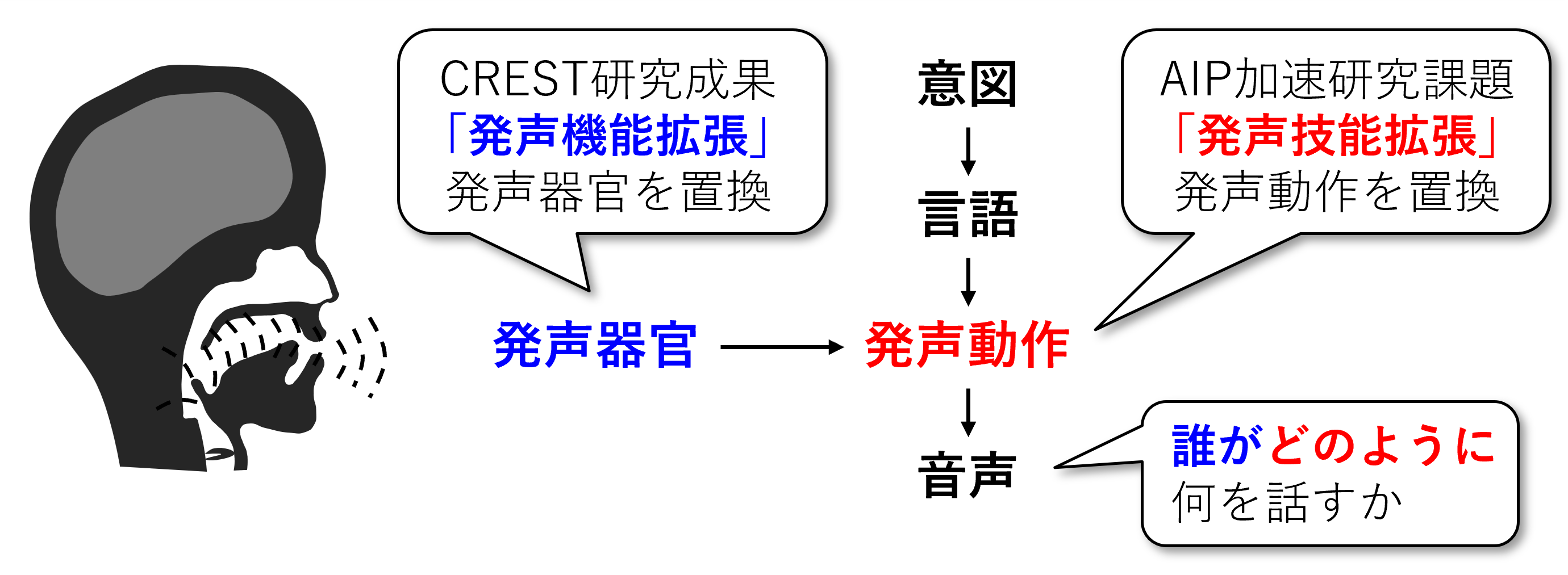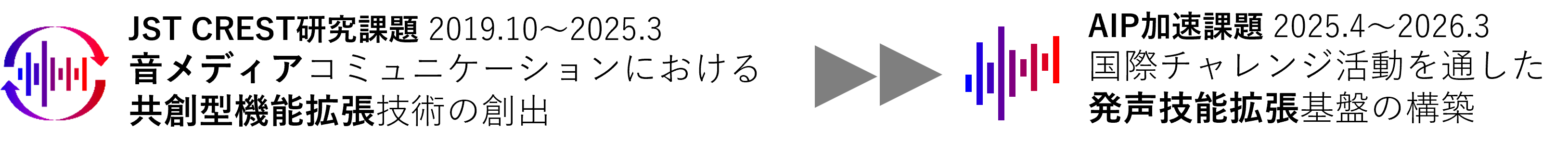 AIP加速課題「発声技能拡張」プロジェクト人工知能技術に基づく音声変換処理を発展させることで、自身の発声器官の特徴(声質など)を保持したまま、発声器官動作の特徴(発声・歌唱表現など)を変換する発声技能拡張基盤の構築に取り組みます。歌唱表現に着目した歌声変換に関する国際チャレンジを開催することで、発声技能拡張に関する研究分野を開拓し、研究を活性化させることで、国際的に本研究分野を主導する立場を確立するとともに、基盤技術の発展を促進します。 ![]() JST CREST「共創型音メディア機能拡張」プロジェクト音メディアコミュニケーションにおいて、ユーザとシステムの共創的な働きかけに基づき、身体的制約を超えて発声・聴覚機能を拡張する基盤技術を創出します。機械学習に基づくデータ駆動型システムの枠組みにおいて、低遅延リアルタイム動作、不随意的なシステム挙動制御、インタラクションを通した意識的なシステム挙動制御を可能とする共創型発声・聴覚機能拡張基盤技術を構築し、発声・聴覚機能の回復・増強を達成します。 ![]()