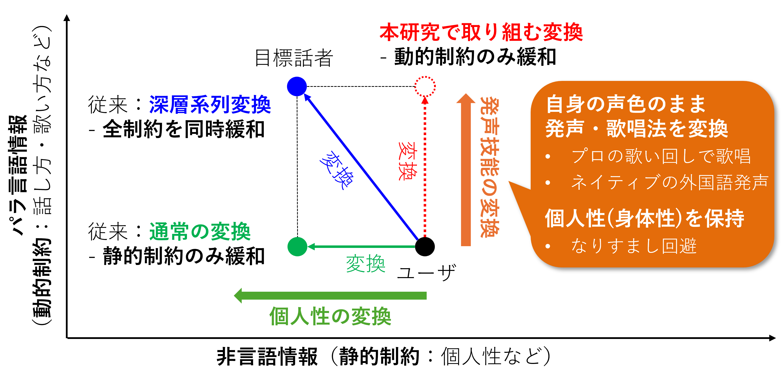 本プロジェクトでは、発声・歌唱技能を拡張した音声・歌声の生成の実現に向けて、より精密に所望の特徴のみを制御可能とする音声変換基盤技術の構築に取り組みます。非言語情報とパラ言語情報の独立制御を可能とし、非言語情報に相当する静的な制約(話者性)は保持しつつ、パラ言語情報に相当する動的な制約(発声表現・歌唱表現)を緩和可能とすることで、音声変換基盤技術を発声技能拡張基盤技術へと発展させます。従来の音声変換では、発声器官の変換、もしくは、発声器官と発声器官動作の同時変換が研究対象とされていましたが、本研究ではさらに発声器官動作のみの変換を実現することで、「音声変換=発声技能の変換」という新たな視点から新規研究分野を開拓し、国際的に本研究分野を主導する立場を確立することを目指します。
