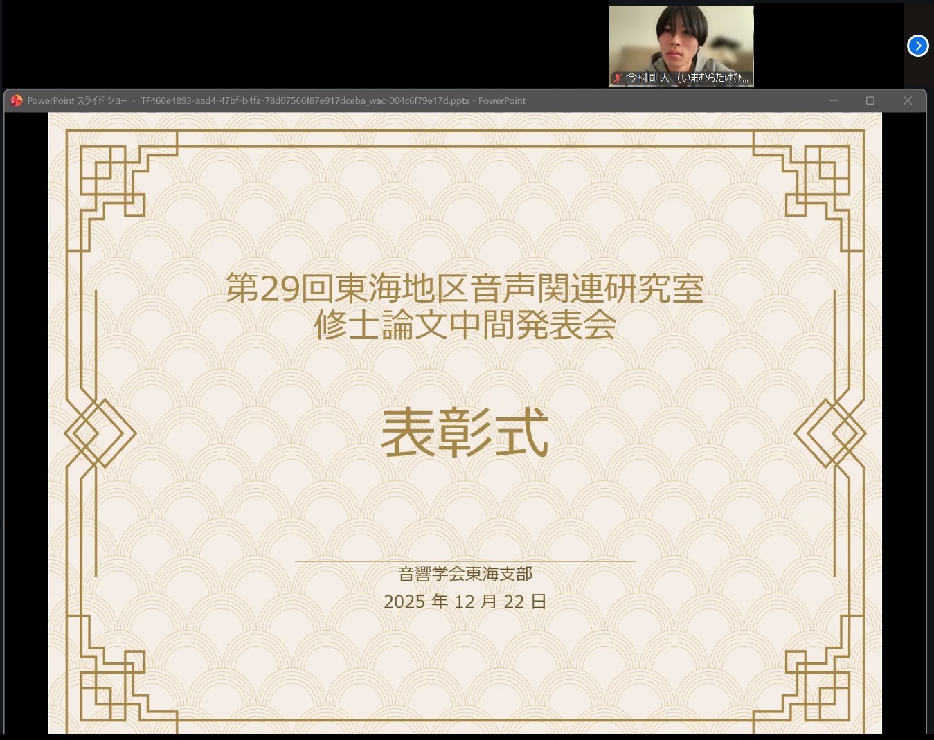 日本音響学会東海支部優秀発表賞の表彰式が行われ,M2学生の今村剛大くんが受賞しました.おめでとうございます!