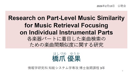 - Yuka Hashizume, "Research on Part-Level Music Similarity for Music Retrieval Focusing on Individual Instrumental Parts," 情報学研究科知能システム学専攻博士論文(主査:戸田 智基)